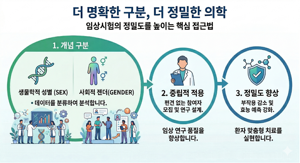 생물학적 특성에 기반한 성별은 약물의 약동학, 약력학, 질환의 발생 양상 등에 영향을 미칠 수 있고, 젠더는 의료 접근성, 건강 관련 행동 양식, 치료 순응도와 같은 사회적 요인과 보다 밀접하게 관련되어 있습니다. 이러한 차이는 서로 다른 방식으로 임상연구 과정에 영향을 미치기 때문에, 임상시험 설계부터 대상자 모집, 운영 및 데이터 분석과정까지 두 개념을 명확히 구분하여 적용하는 것이 중요합니다.