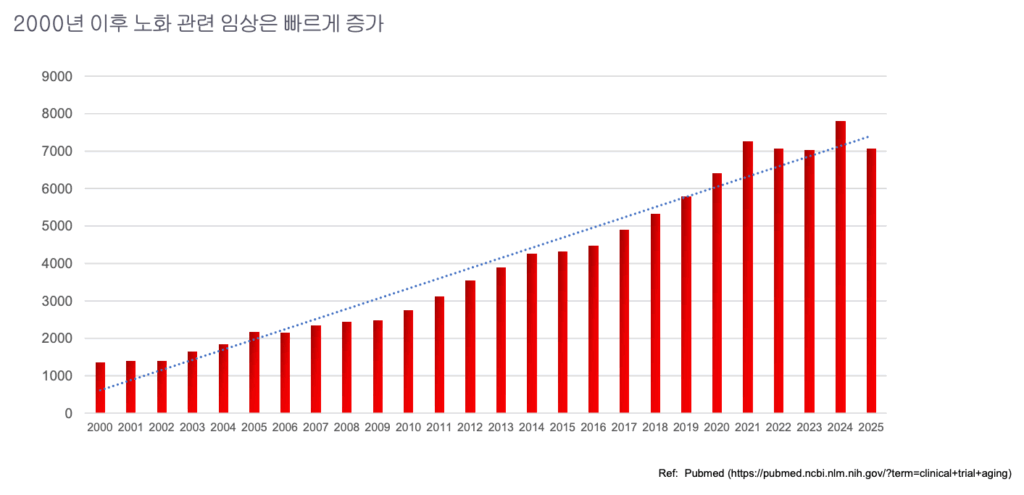 2000년 이후 노화관련 임상시험은 고령 인구 증가에 따라 꾸준히 확대되고 있으나, 여전히 노인의 참여율은 낮습니다.