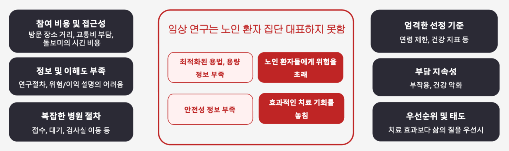 원인으로는 접근성 문제(교통, 비용, 병원 절차), 엄격한 선정 기준, 정보 부족, 삶의 질 우선 등이 꼽힙니다. 그 결과 노인을 대표하지 못하는 연구가 이루어지고, 최적 용량·용법 및 안전성 정보 부족으로 이어지고 있습니다.