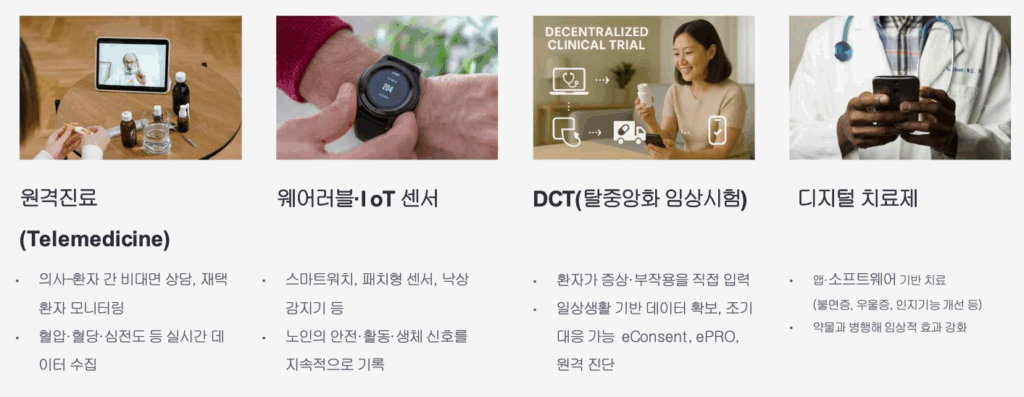 이를 개선하기 위해 디지털화를 통한 접근이 주목받고 있습니다. 원격진료, 웨어러블 센서, eConsent, ePRO, 디지털치료제 등을 활용하면 환자 참여 장벽을 줄이고, 실시간 데이터 수집 및 안전성 모니터링이 가능합니다. 특히 치매·인지장애 환자를 대상으로 한 디지털 펜, 원격 모니터링, 온라인 중재 프로그램 등 국내외 사례에서 높은 순응도와 긍정적 효과가 확인되었습니다.